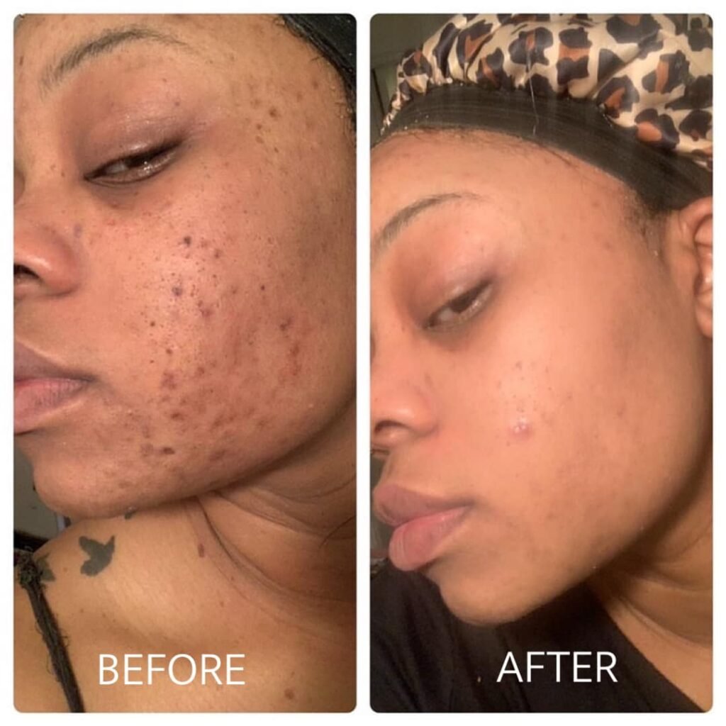 "I’ve struggled with dark spots and acne scars, and have been on the search for something to help. After finding this product, I noticed a difference within one month! These pictures are 6 weeks apart!! I have been getting so much complements on my skin and i no longer go out with makeup. I love to show up my skin."